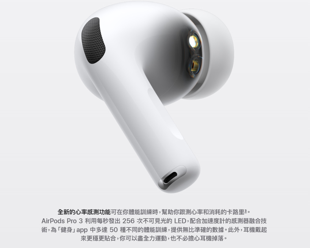 不只是音樂耳機,AirPods Pro 3更是健康管理的小助手!AirPods Pro 3首次加入「心率感測」功能,內建感測器能以每秒 256 次的不可見光 LED,搭配加速度計技術,精準捕捉耳內血流變化,隨時監測使用者的心率數據。搭配「健身」App,可支援多達 50 種運動模式,無論跑步、瑜伽或重訓,都能即時掌握心率與卡路里消耗,讓運動紀錄更完整。