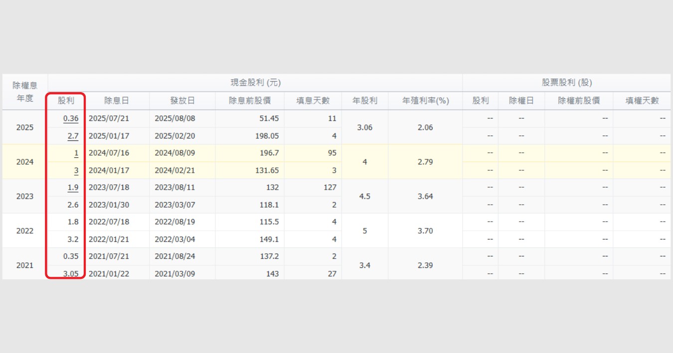 對投資人而言,代表每持有一股,就能在該年度拿到 0.5 元的股利收入。