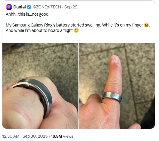 Rotar 表示,事情發生在他準備從夏威夷搭機的時候。當時他發現手上的 Galaxy Ring 出現異常腫脹,戒身內部甚至出現明顯凸起與分層。更糟糕的是,戒指卡死在手指上,讓他完全無法自行取下。