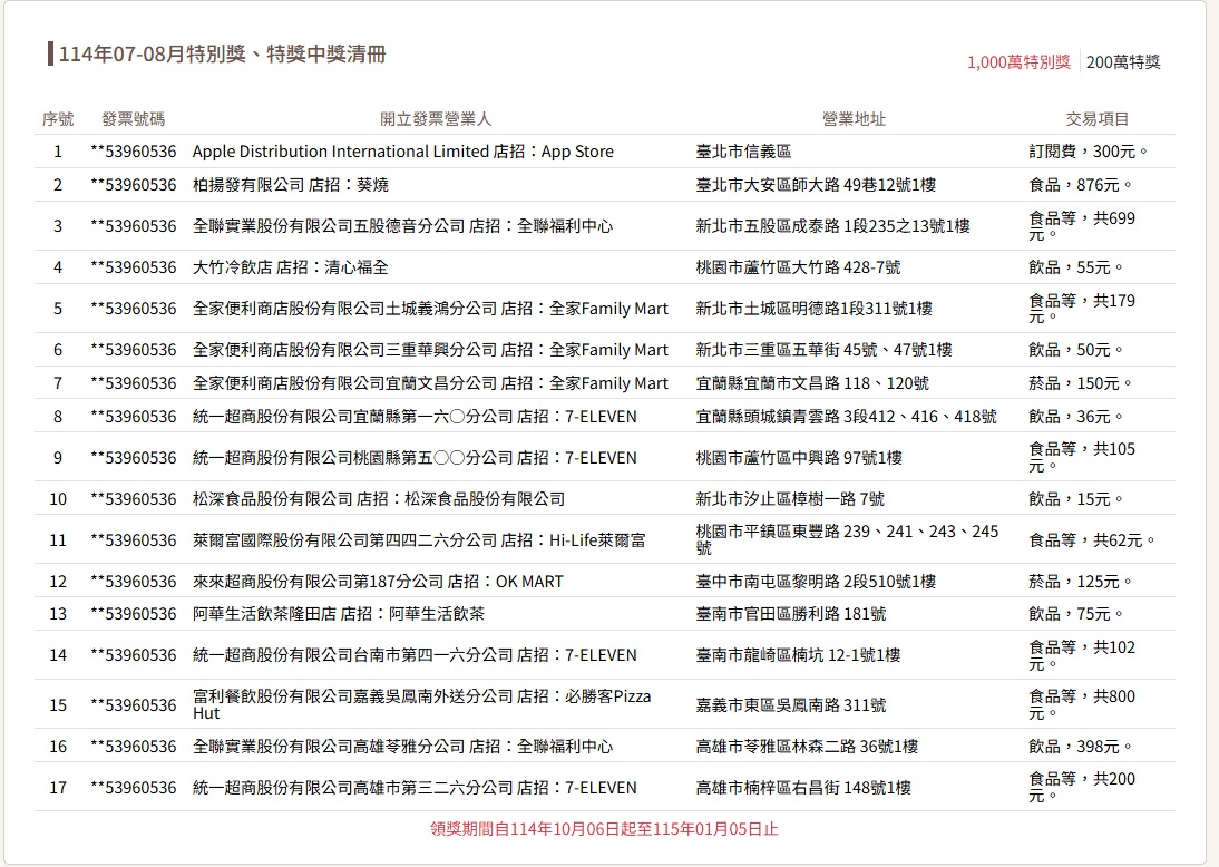 在特別獎號碼 53960536 的名單裡,最顯眼的是一筆 15 元的飲品,直接抱走千萬獎金。此外,消費紀錄涵蓋全台各地的日常場景: