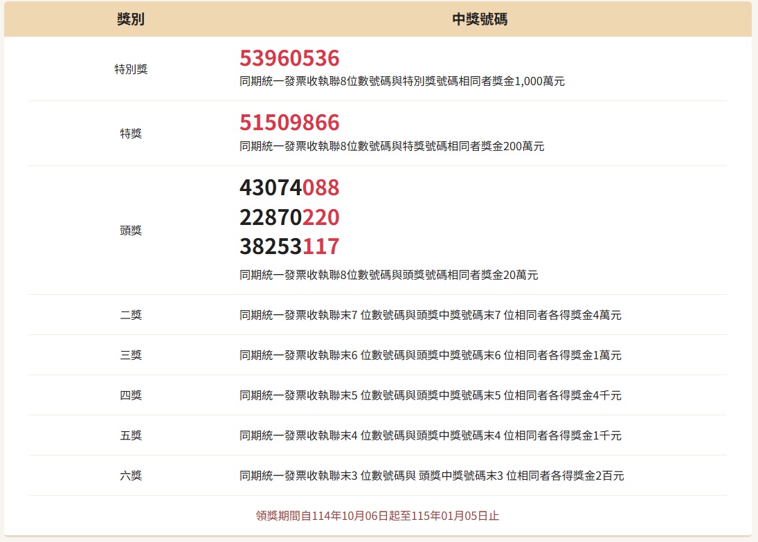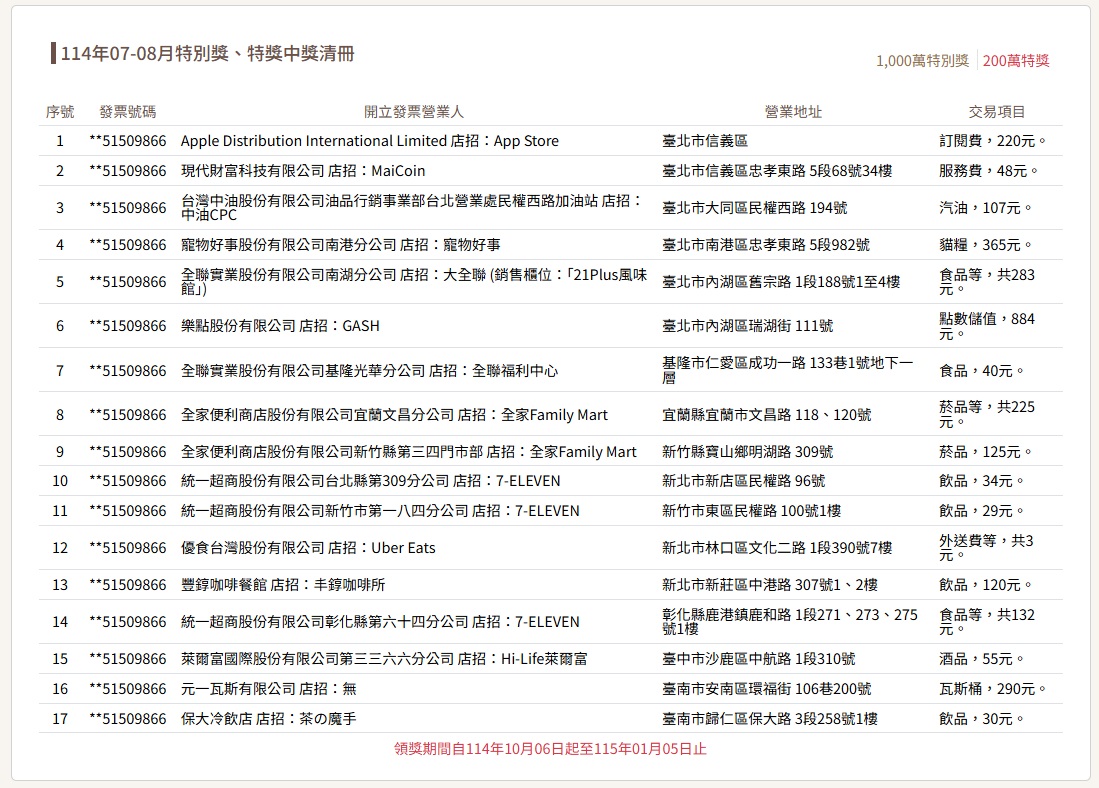 財政部公布 114 年 7-8 月統一發票特別獎與特獎中獎清冊,這次可說是驚喜滿滿,除了15元變成千萬富翁,甚至還有3元外送費中200百萬的幸運兒!