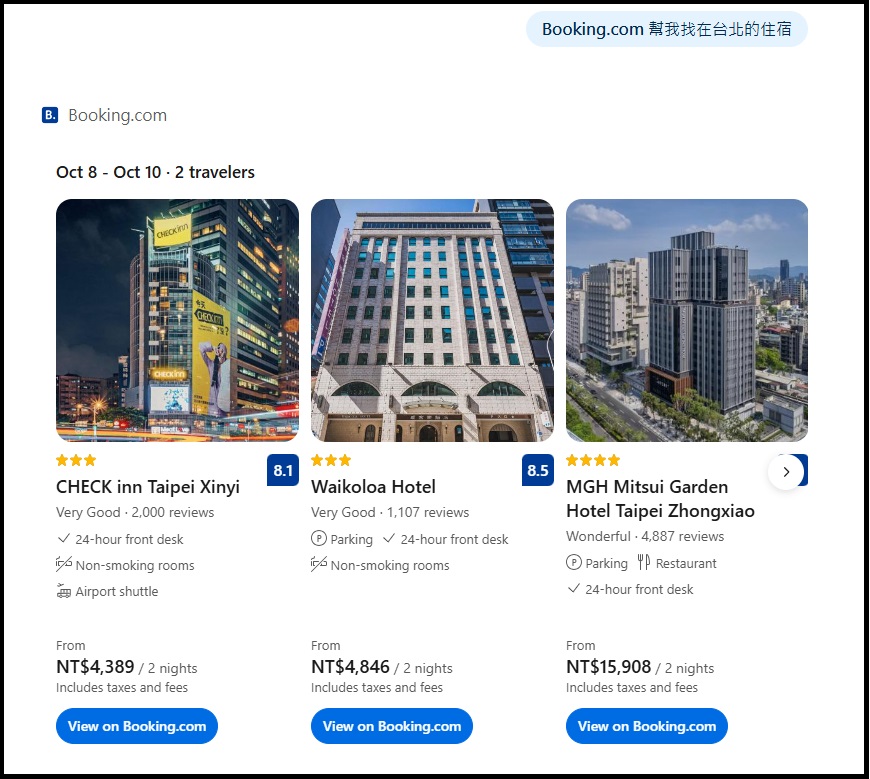 例如要求 ChatGPT:「Booking.com 幫我找台北的住宿」,系統就會自動透過 Booking.com 幫你列出選項和連結,加上 AI 理解語意的能力,操作更直覺、簡單。