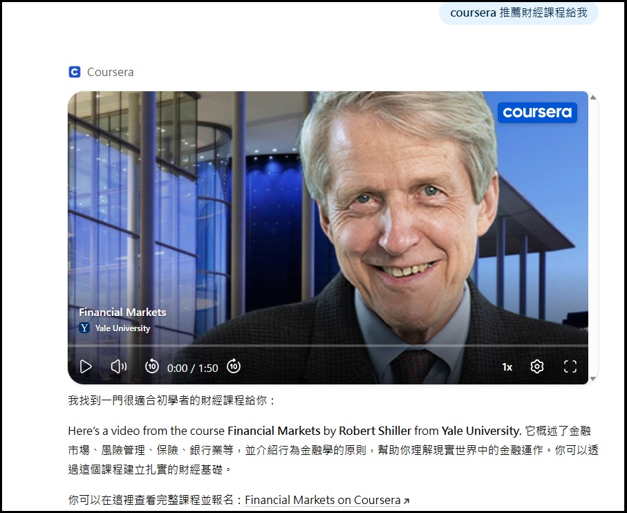 線上學習平台 Coursera 讓 ChatGPT 不只能回答問題,還能推薦影片與課程。當用戶在對話中提及某主題時,ChatGPT 可能直接連結 Coursera 的教學內容,成為互動式學習入口。