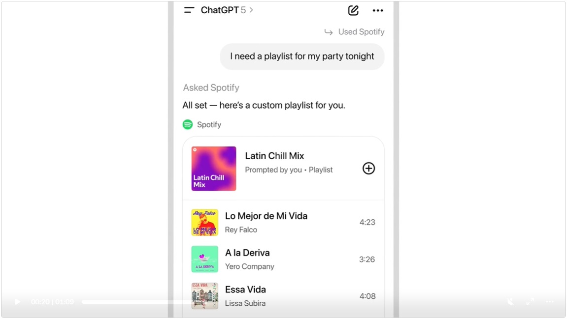Spotify 的整合讓使用者能連結帳號,直接在 ChatGPT 裡找歌、建歌單或獲得推薦。免費用戶可從既有歌單中挑選,付費用戶則能獲得依對話內容客製的歌單。