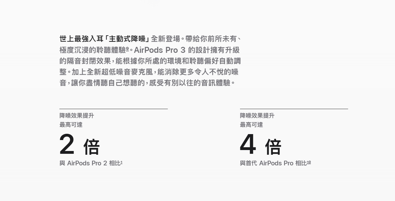 AirPods Pro 3 搭載的是「H2 晶片」,結合特製的 Apple 聲學系統,帶來更低的失真率、渾厚的低音及更清透的高音表現,整體性能&耗能表現都很優異。AirPods Pro 3內建「皮膚感應器」,具備「主動式降噪」、「通透模式」、「適應性等化」、「對話感知」、「個人化空間音訊」…等多項功能,結合全新多孔聲學架構,能精準控制氣流,透過內向式麥克風將聲音導入耳道,讓低音更深沉、人聲更清晰,音場更開闊。耳機若搭配 Apple Vision Pro,還能支援保真壓縮音訊,展現極致音樂細節。全新「適應性等化」功能,會依照耳型和配戴貼合度,自動調整音訊,搭配動態頭部追蹤,提供宛如身臨其境的沉浸體驗。適應性通透模式能降低嘈雜聲音,卻依然保留必要的環境聲;此外也支援「音訊共享」,讓你能跟朋友同步欣賞音樂或影片。值得一提的是,AirPods Pro 3耳機的降噪表現再進化,內建超低噪音麥克風與進階演算法,相較於前代機款降噪提升 2 倍,跟初代相比更高達 4 倍,無論通勤或戶外皆能安靜享受。確保安全。而「對話感知」功能能在你與他人交談時,自動降低音樂音量,讓互動更自然。