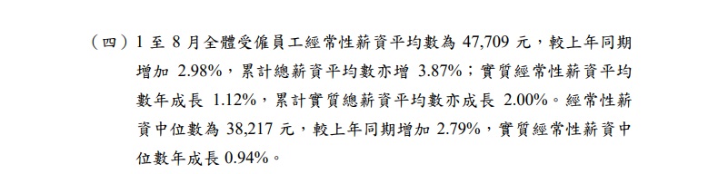 主計總處14日公布最新薪資統計資料,今年前8月工業及服務業受僱員工每人每月經常性薪資平均為新台幣4萬7709元,年增2.98%,前8月經常性薪資中位數為3萬8217元,年增2.79%。由於薪資成長幅度超越物價漲幅,實質薪資同步提升,顯示整體薪資成長具一定實質意義。