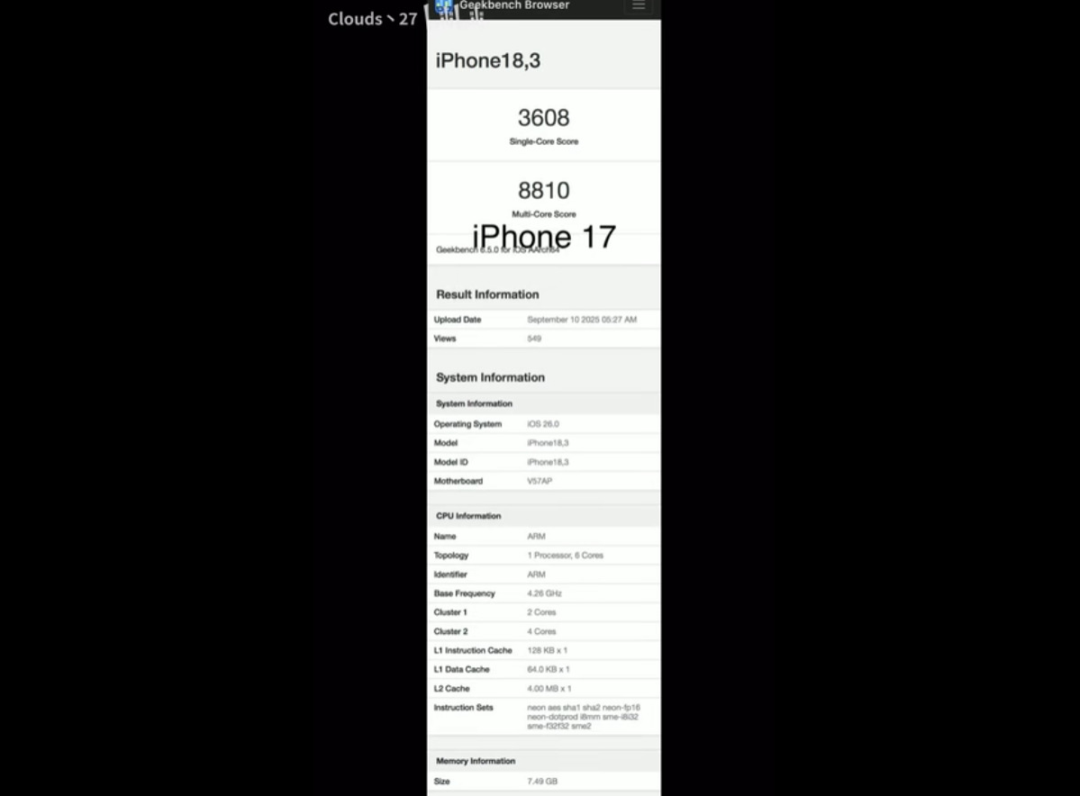 根據跑分軟體Geekbench 6的效能測試結果顯示,iPhone 17:搭載A19 晶片+8GB 內存,單核心CPU 跑分是3608 分,多核心跑分為8810 分,GPU 跑分為37014 分。跟上一代iPhone 16的A18 晶片相比,CPU 單核心跑分提升了10%,多核心跑分提升11%,GPU 跑分則提升了33%。另一款iPhone Air:搭載閹割版A19 Pro 晶片(6 核心CPU+5核心GPU),配備12GB 內存,單核跑分為3674 分,多核心跑分則是8824 分,Metal GPU 跑分高達 37743分。