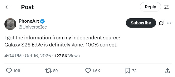 知名爆料者 Ice Universe 表示,根據他掌握的獨立消息來源,「Galaxy S26 Edge 已確定取消,百分之百正確。」另一位知名爆料者 OnLeaks 也以「That's true」回應此傳聞,進一步印證消息可信度。