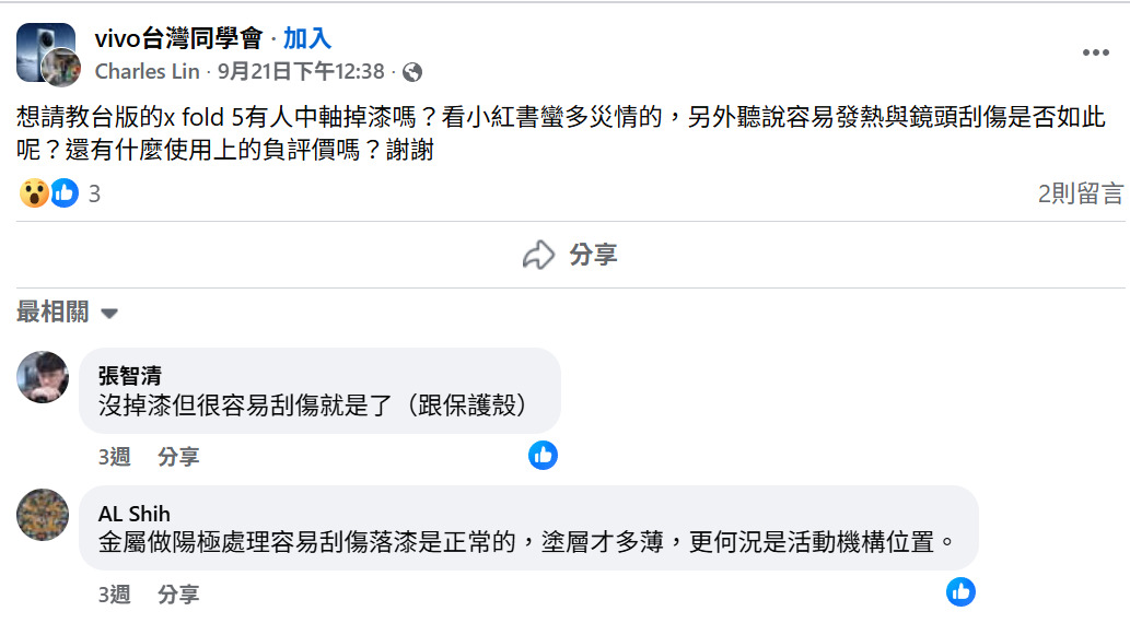 有網友發問:「看到小紅書上,中國版vivo X Fold5蠻多災情的,想請教台版有人中軸掉漆嗎?」,有台灣用戶留言回應「沒掉漆但很容易刮傷就是了(跟保護殼)」,另一名網友則補充說明「金屬做陽極處理容易刮傷落漆是正常的,塗層才多薄,更何況是活動機構位置」,目前看下來,台版vivo X Fold5沒有什麼「中軸掉漆」的災情回報。