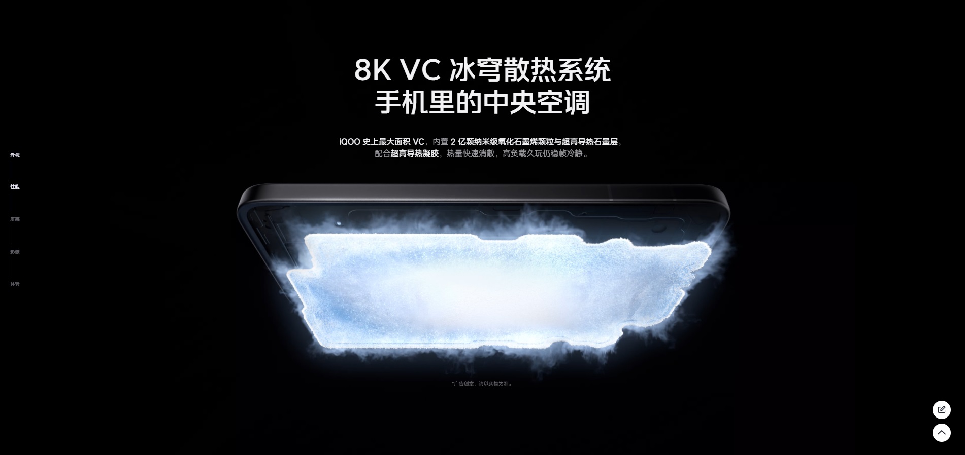 遊戲手機最怕發熱導致卡頓,但 iQOO 15 搭載 8K VC 冰穹散熱系统,內含 2 億個奈米氧化石墨烯顆粒,導熱效率提升 5%。
