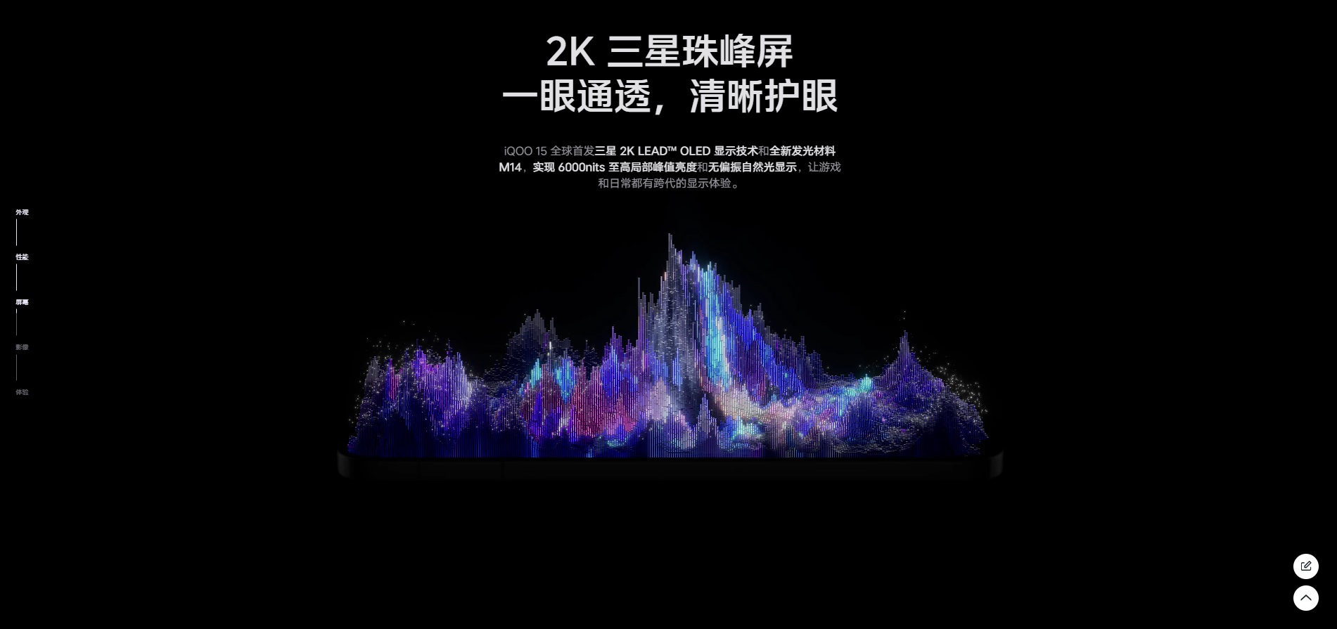 iQOO 15 採用一塊 6.85 吋 2K+ 解析度的 LTPO AMOLED 螢幕,不僅支援 最高 144Hz 螢幕更新率,還具備先進的 Samsung M14 發光材質,能在不同場景下動態調整更新率,提升流暢度又省電。
