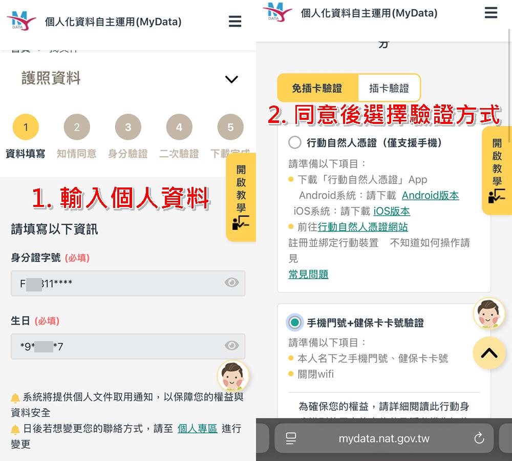 點擊下方傳送門前往「個人化資料自主運用(MyData)」平臺,先填寫個人資料:身分證字號和生日。