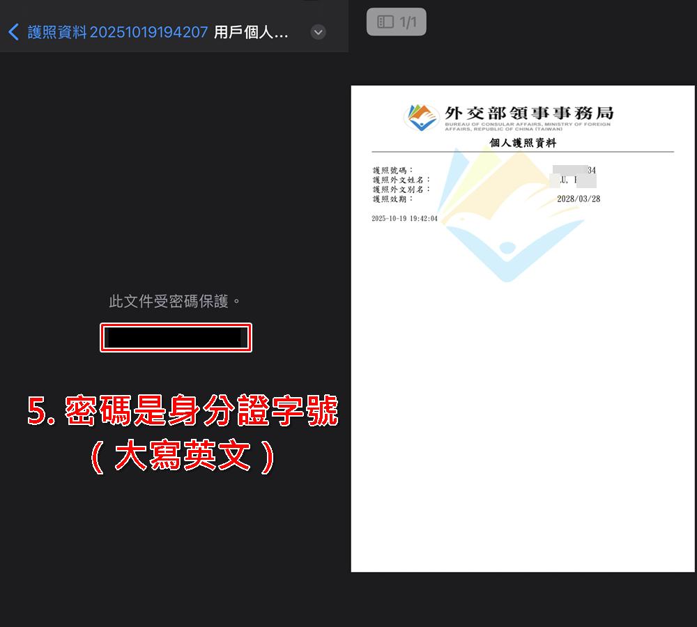 最後只要選擇「護照資料」>「下載」,即可將你的護照資料下載到手機裡。檔案密碼是本人的「身分證字號」(大寫英文字母),開啟後就會看到你的護照號碼、姓名、有效期限等資料囉!