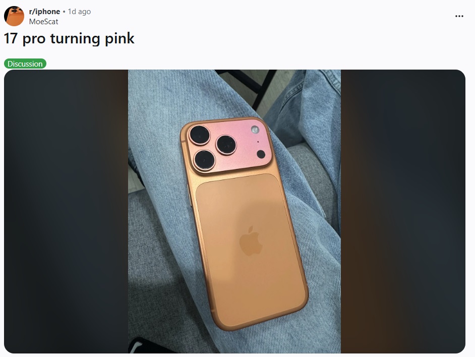 目前這種狀況似乎只出現在少數 iPhone 17 Pro 用戶身上,但 Reddit等社群上已出現多張對比照片,顯示橘色邊框的確有明顯變淡甚至轉粉紅的現象。