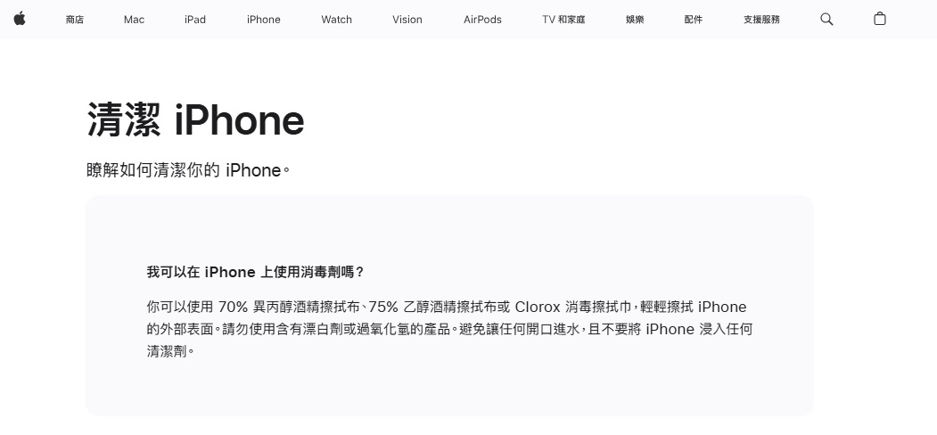 從蘋果的清潔指南中可以看到,用戶可以使用含 70% 異丙醇或 75% 乙醇酒精的擦拭布清潔手機,但應避免含漂白水或雙氧水的產品。