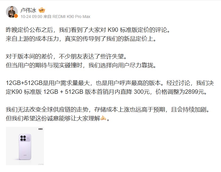 小米總裁盧偉冰在社群平台發文指出,目前記憶體價格「遠超預期」,漲勢還可能持續一段時間,公司被迫將成本壓力反映在新產品定價上。