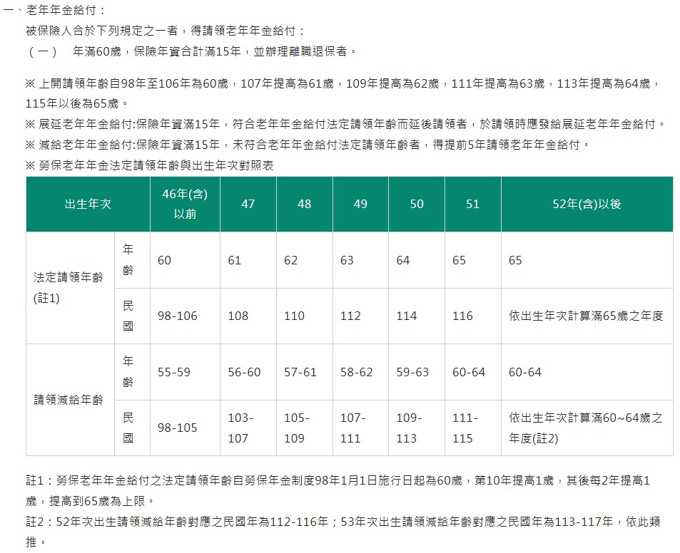 根據《勞工保險條例》,勞保老年年金自2009年開辦時便設定了「漸進式調升」請領年齡的規劃。2009-2017年為60歲、2018年為61歲、2020年為62歲、2022年為63歲、2024年為64歲,而2026年將最終達到65歲。