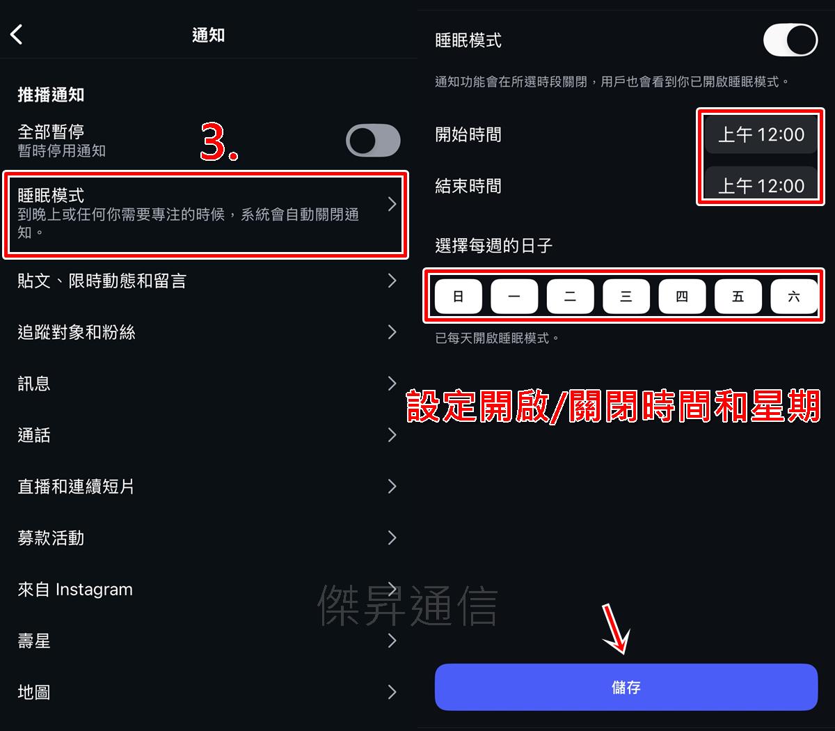 開啟功能後,你可自訂睡眠模式的「開始時間」、「結束時間」,以及「星期幾」要啟用,IG日後就會依照你設定的時段,自動啟動和解除睡眠模式。