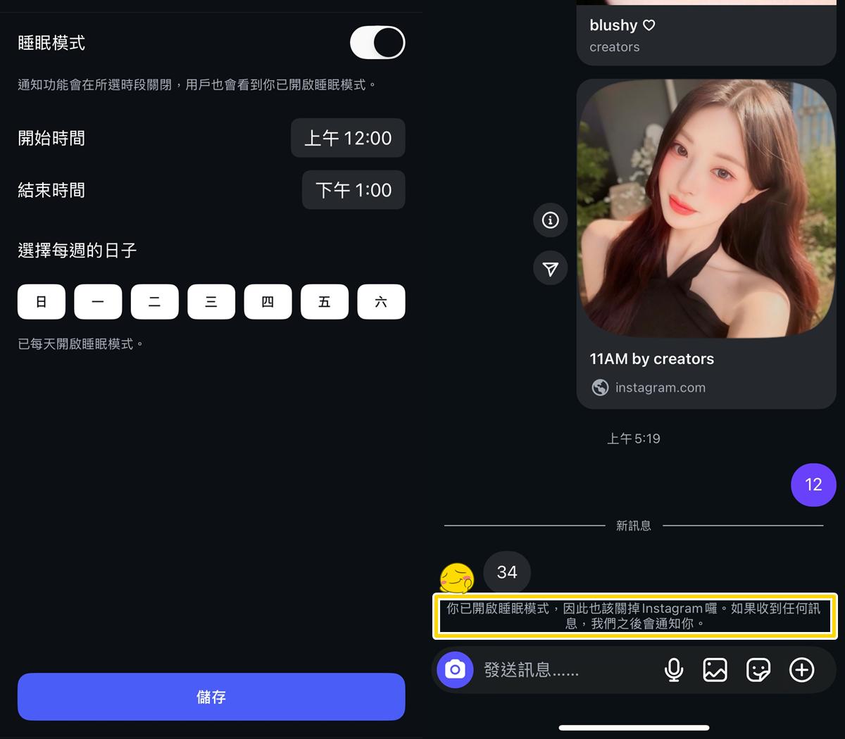 Instagram(IG)的「睡眠模式」類似於手機的勿擾模式,當用戶開啟後: