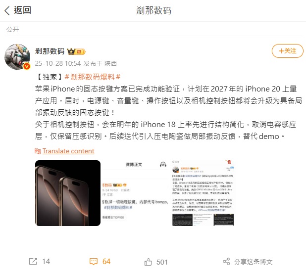 根據中國爆料者「剎那數碼」在微博上的消息,蘋果已完成新一代固態按鈕的功能測試,預計會在 2027 年的 iPhone 20 上投入量產。
