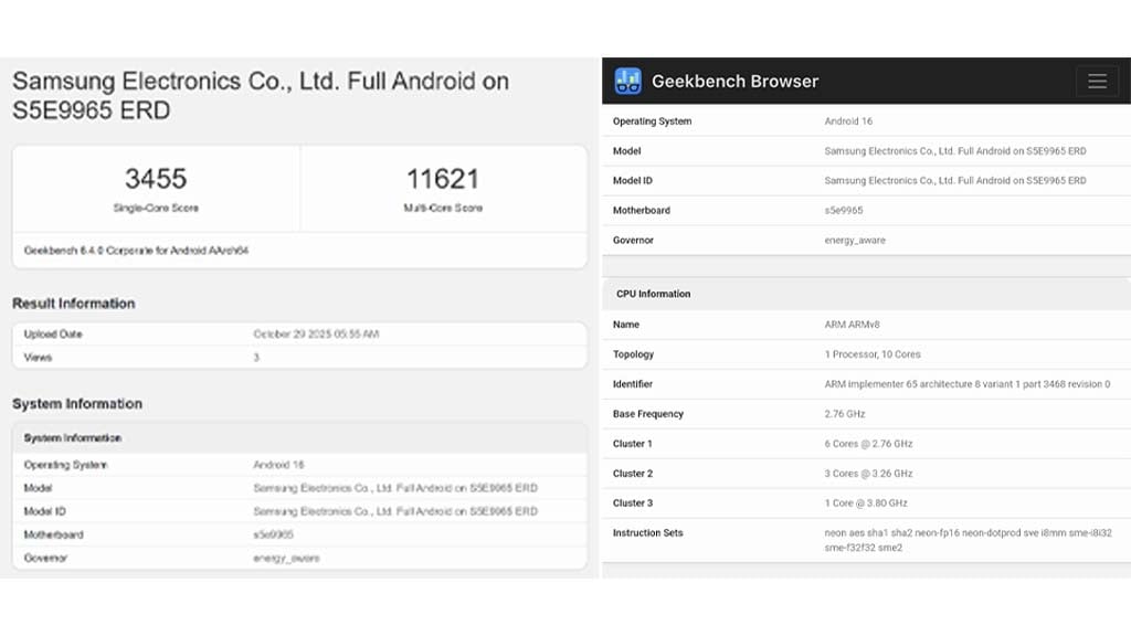 據了解,這次測試的晶片主核心時脈達到 3.80GHz,另外的六核心群組為 2.76GHz,三核心群組則為 3.26GHz。與前一週的版本相比,主核心由 3.55GHz 提升至 3.80GHz,顯示三星針對時脈配置與能耗平衡進行了再調整。
