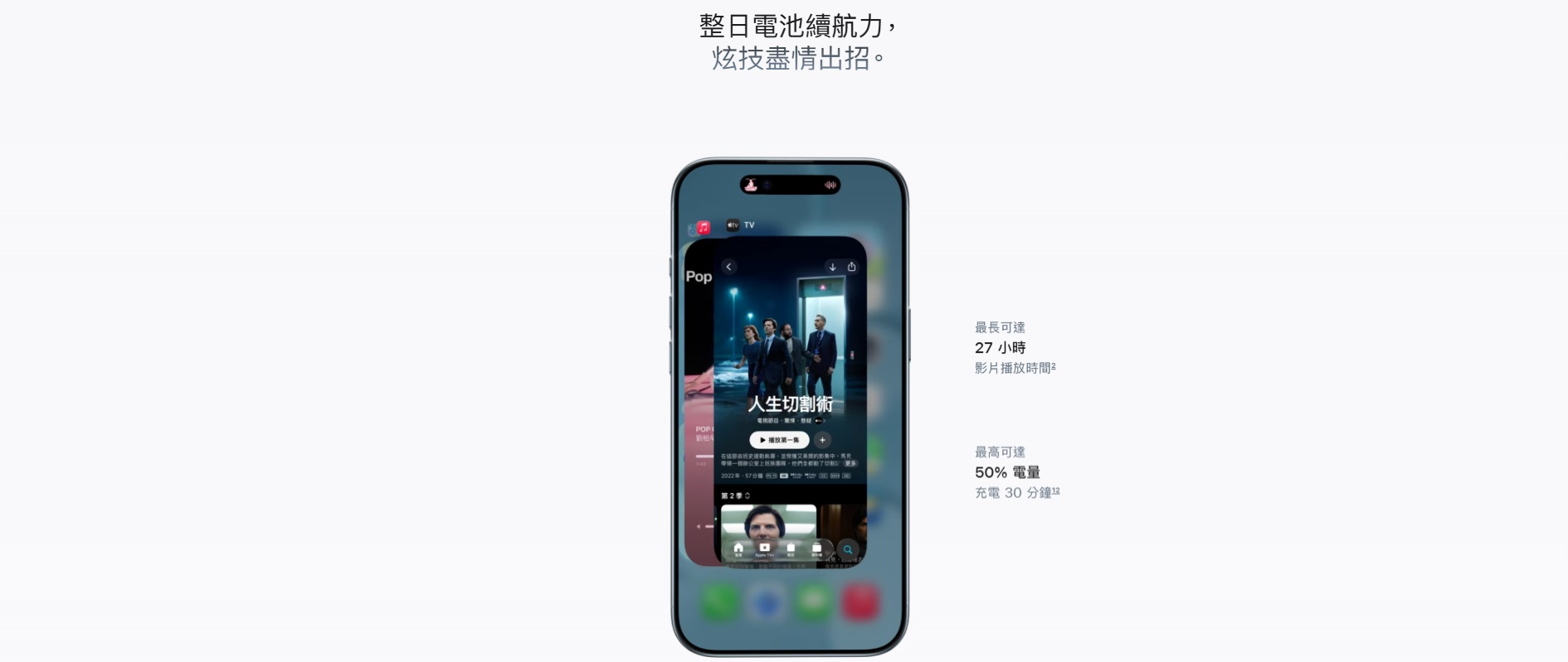 雖然更薄,但電池表現也不容忽視,iPhone Air 透過重新設計內部空間,容納更高效能電池,官方指出影片播放最長可達 27 小時。