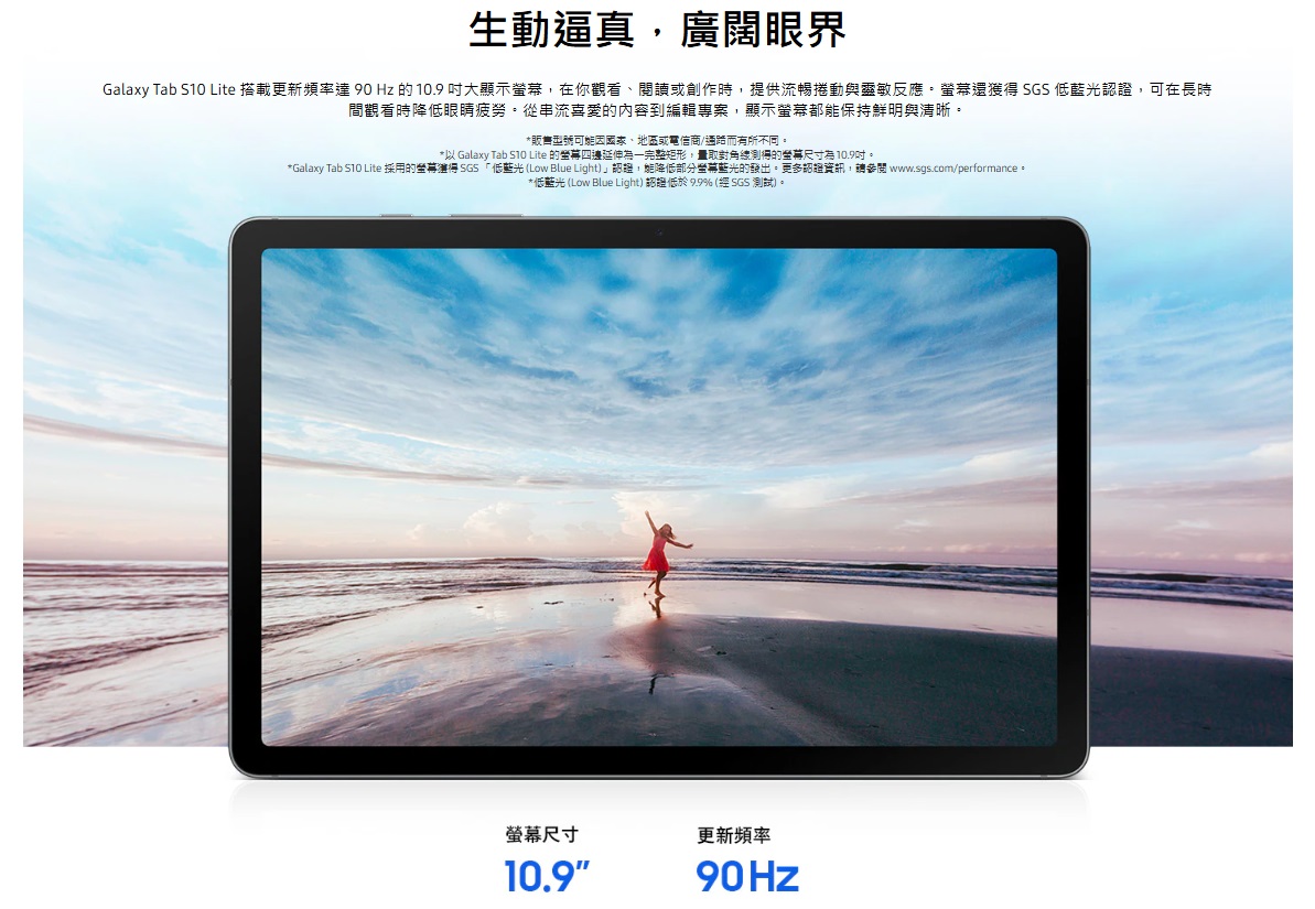 Tab S10 Lite 則配備 10.9 吋 TFT 面板,解析度 2,112 x 1,320,支援 90Hz 更新率,畫面同樣滑順,搭載 Vision Booster 技術可依環境光線智慧調整對比度與色彩,並通過 SGS 低藍光認證,長時間使用也不易疲勞。