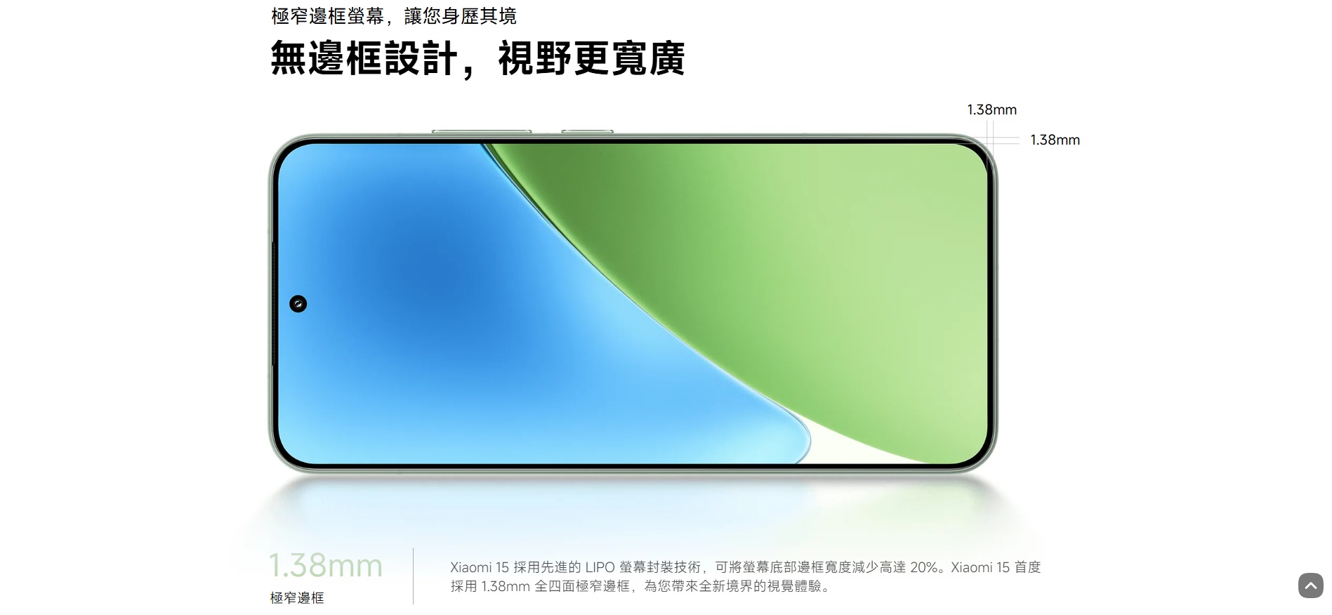 Xiaomi 15 採用 6.36 吋 CrystalRes AMOLED 螢幕,解析度 2670x1200,支援 1~120Hz 自適應更新率與 3200 尼特峰值亮度,螢幕四邊僅 1.38mm 超窄邊框,搭配 LIPO 封裝技術,視覺更無邊際!機身材質為 鋁合金邊框+小米龍晶玻璃,具備不錯的耐刮抗摔力。