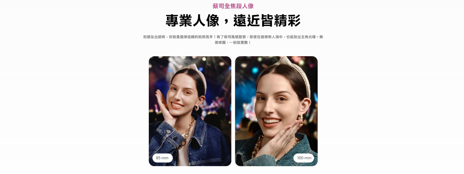 最吸睛的是「蔡司全焦段人像」,一鍵切換五大焦段(23、35、50、85、100mm),搭配不同蔡司散景風格(如 Biotar、Sonnar、Planar 等),遠近都能拍出電影感人像。