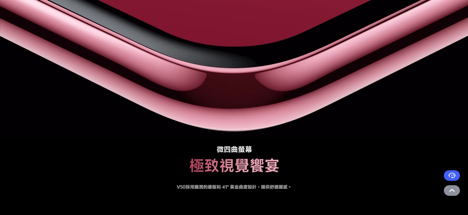 V50 則採用 微四曲螢幕 與 41° 黃金曲度邊框,帶來更自然的手感。螢幕亮度最高約 4500 nits,支援 120Hz 更新率與 P3 廣色域顯示。
