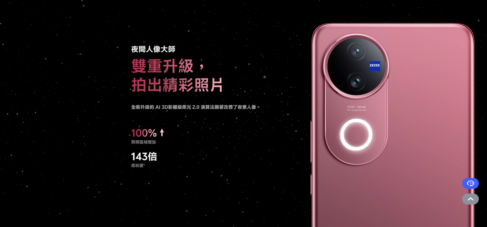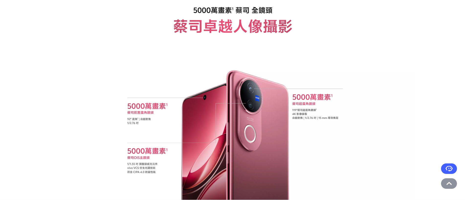 | 後置 | 5000萬畫素 蔡司超級長焦鏡頭 | 5,000 萬畫素 蔡司主鏡頭 獨家AI影棚級柔光環 |