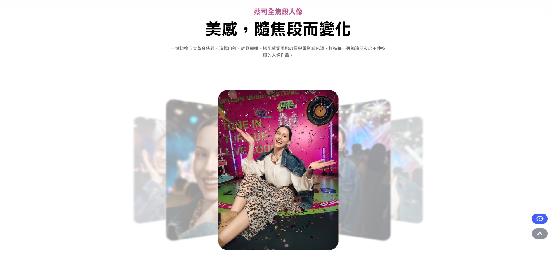 最大特色是 「五焦段蔡司人像模式」,可自由切換 23mm、35mm、50mm、85mm、100mm 焦段,搭配蔡司散景風格,從街拍到特寫都能呈現專業級層次。