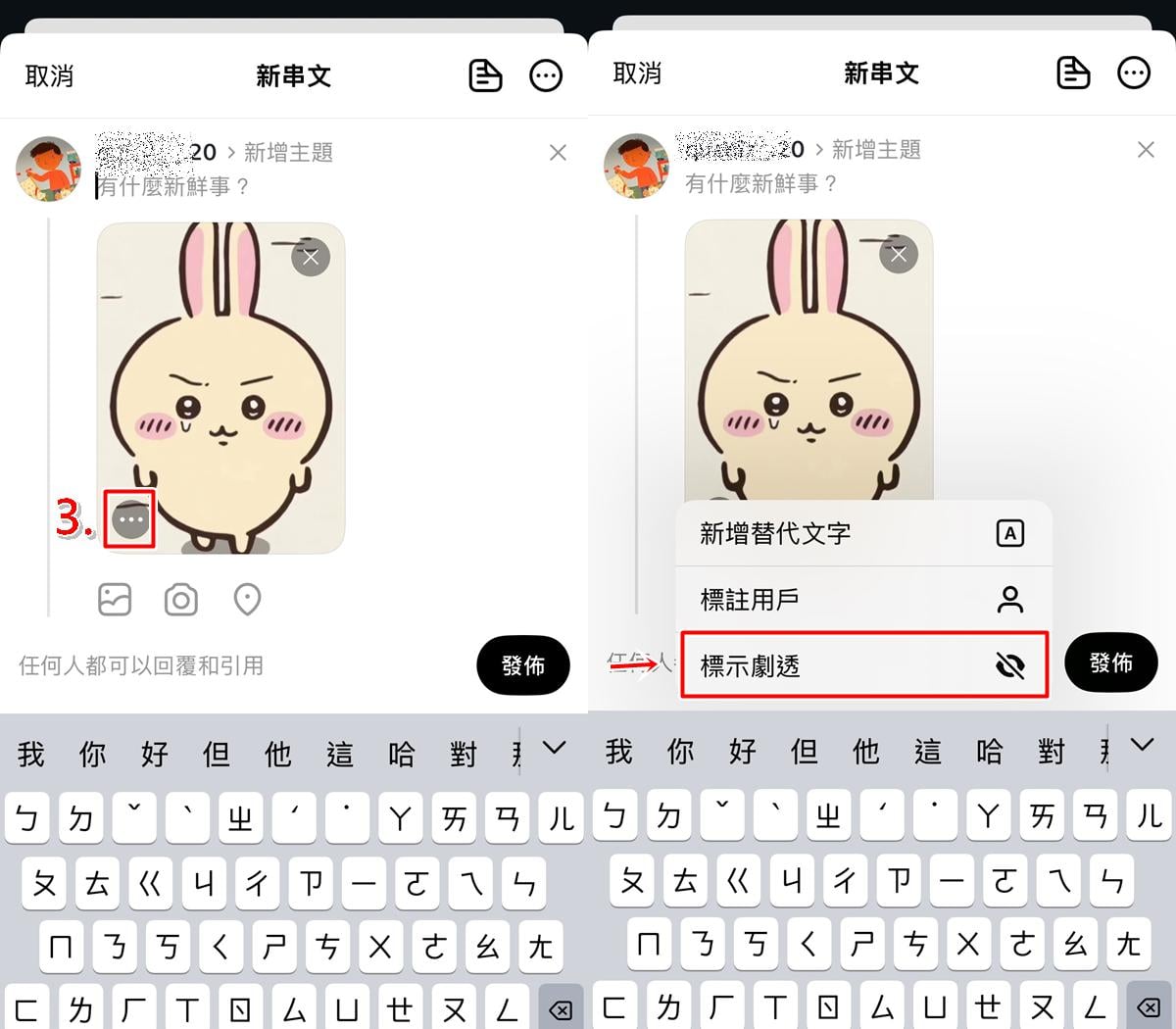 上傳好你要的圖片後,點選圖片左下角的「…」>「標示劇透」,圖片就會被隱形起來了!