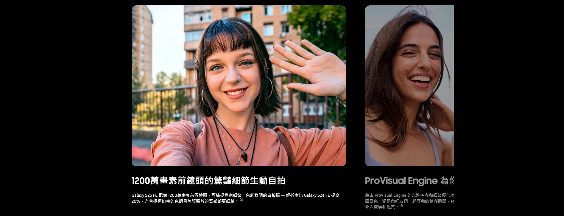 S24 FE 同樣搭載三鏡頭組合(5000 萬廣角+1200 萬超廣角+800 萬望遠),前鏡頭為 1000 萬畫素。主打 ProVisual Engine,擁有 Super HDR、生成式慢動作、AI 修圖與 Portrait Studio 棚拍人像等功能。