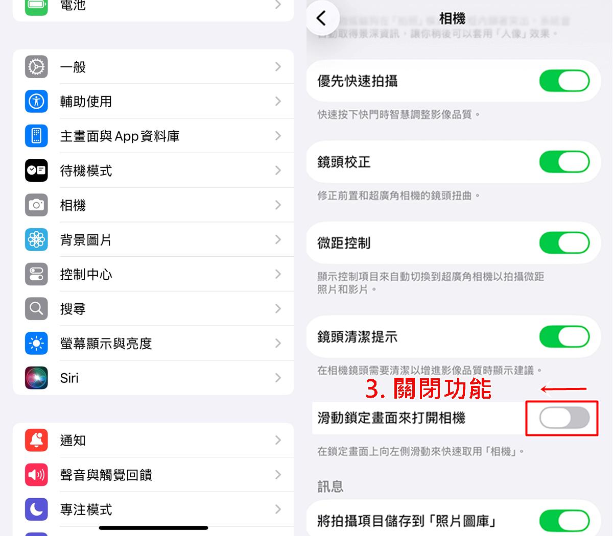 下滑找到「滑動鎖定畫面來打開相機」,並將此功能關閉,這樣就能成功關閉左滑相機囉!