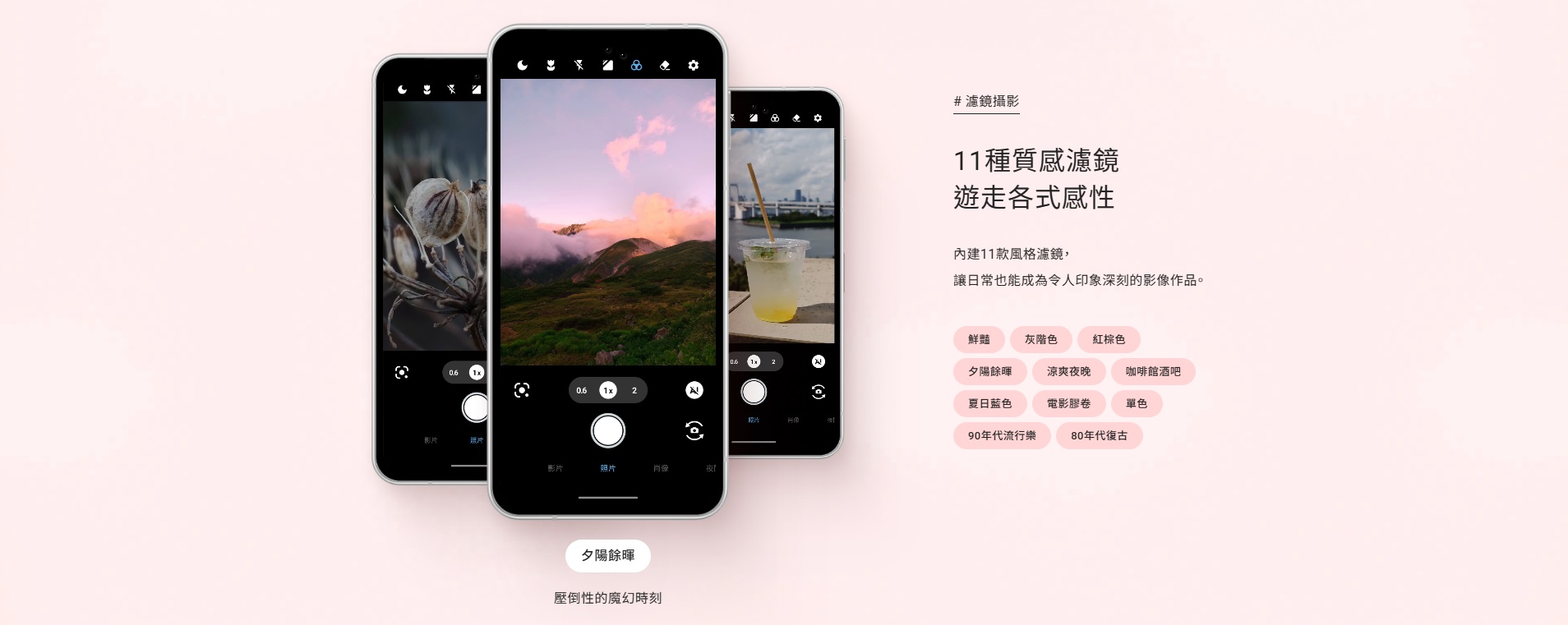 另外,加上 11 種質感濾鏡,例如「夕陽餘暉」「咖啡館酒吧」「電影膠卷」等,輕鬆拍出有風格的影像。
