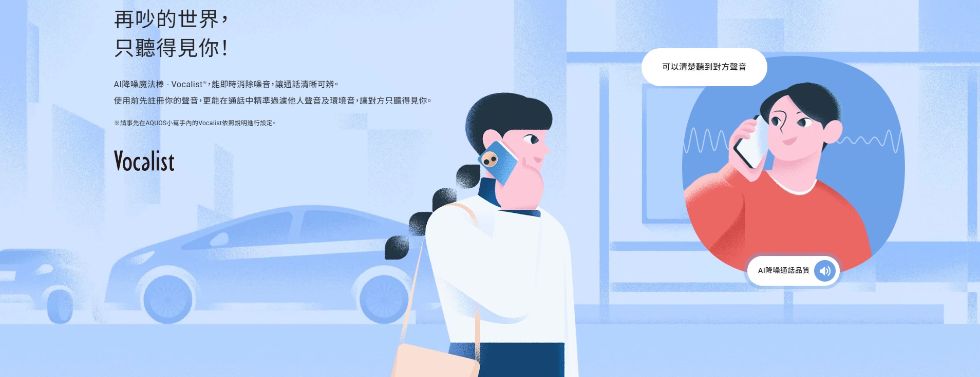 AQUOS sense10 主打的「AI降噪功能 Vocalist」,就像把你的聲音當作專屬會員,只要設定好後,手機能準確辨識使用者的聲音來源,在你講電話時即時過濾他人聲音與環境噪音,讓對方清楚聽見你,即使身處馬路邊、捷運站或咖啡廳,也不再需要重複講話。