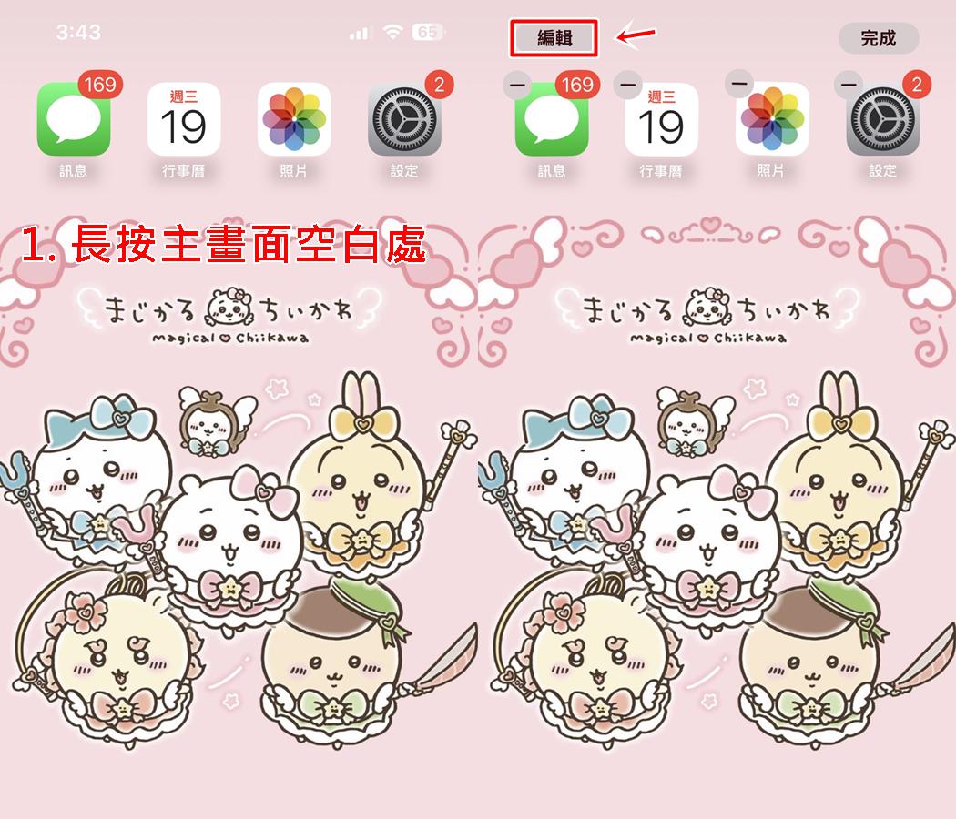 請先在iPhone主畫面「長按」,點擊左上角「編輯」。