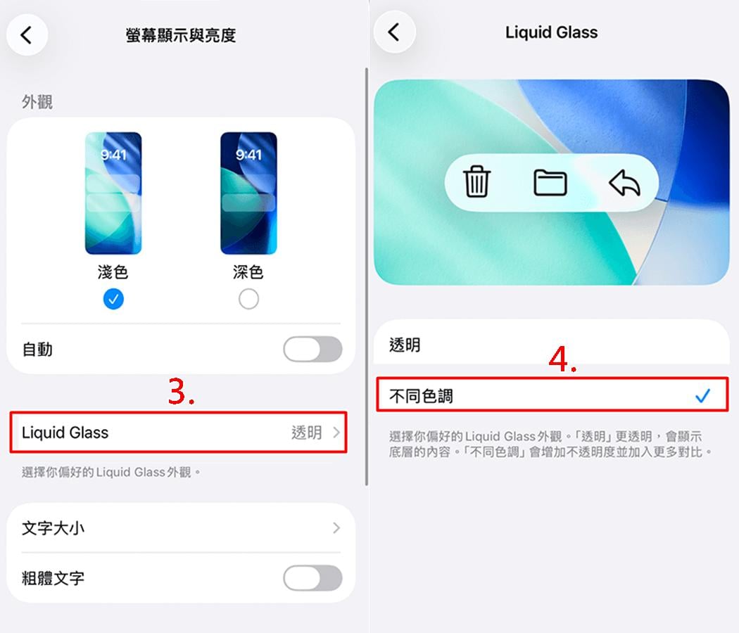 接著選擇「Liquid Glass」,將預設的「透明」改成「不同色調」的選項。