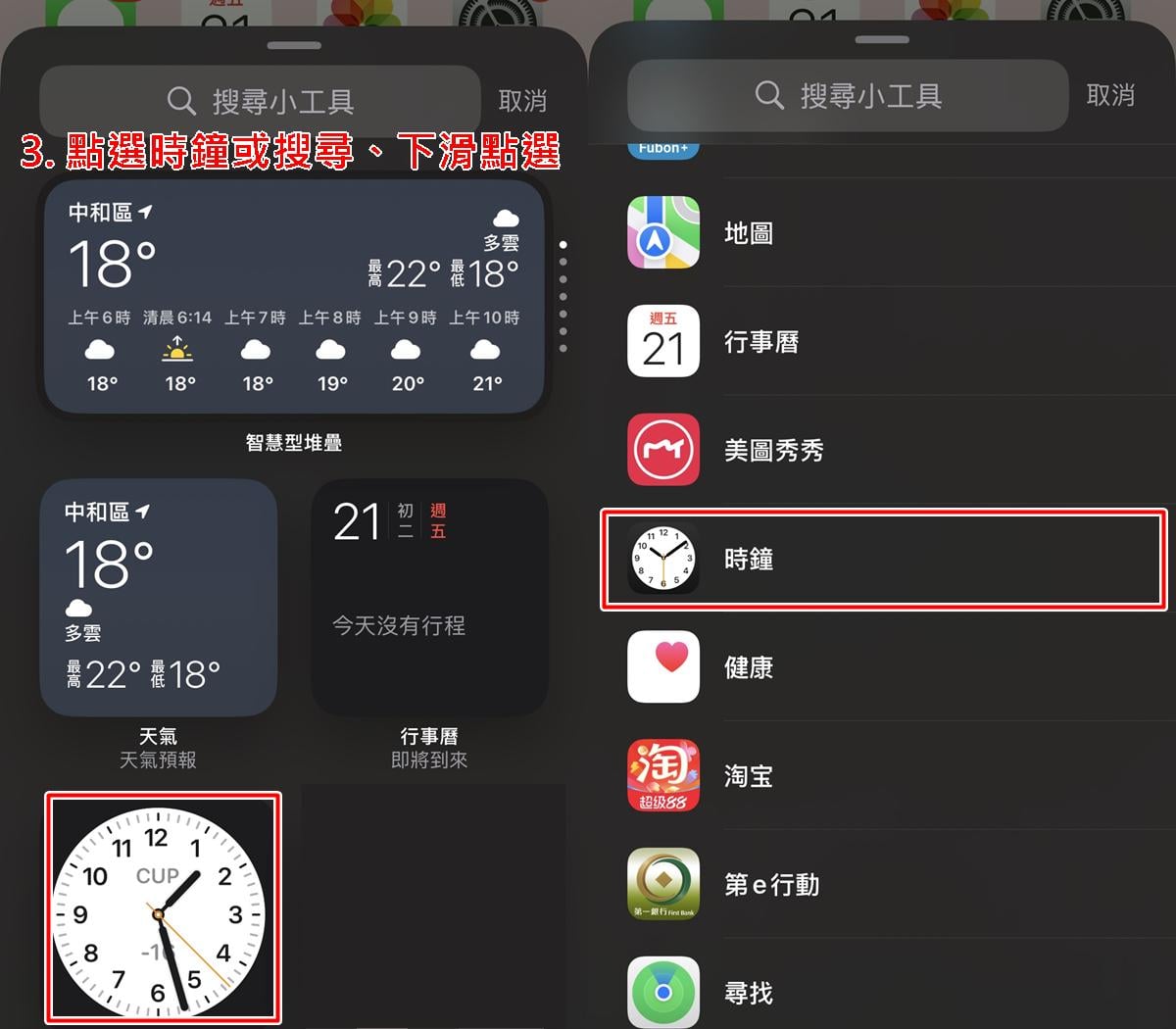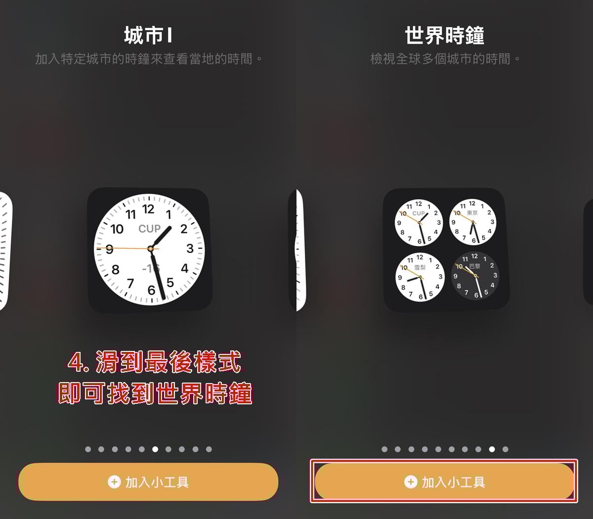 搜尋或滑到點選「時鐘」小工具,選擇想要的世界時鐘樣式(在最後面)。