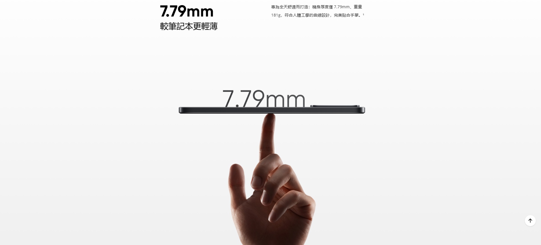 機身厚度約 7.79mm、重量 181g,背面為霧面細緻質感,帶有緞面光澤,提供月輝銀、鈦空灰兩色選擇,手感與外型兼具,拿在手上既優雅又不滑手。