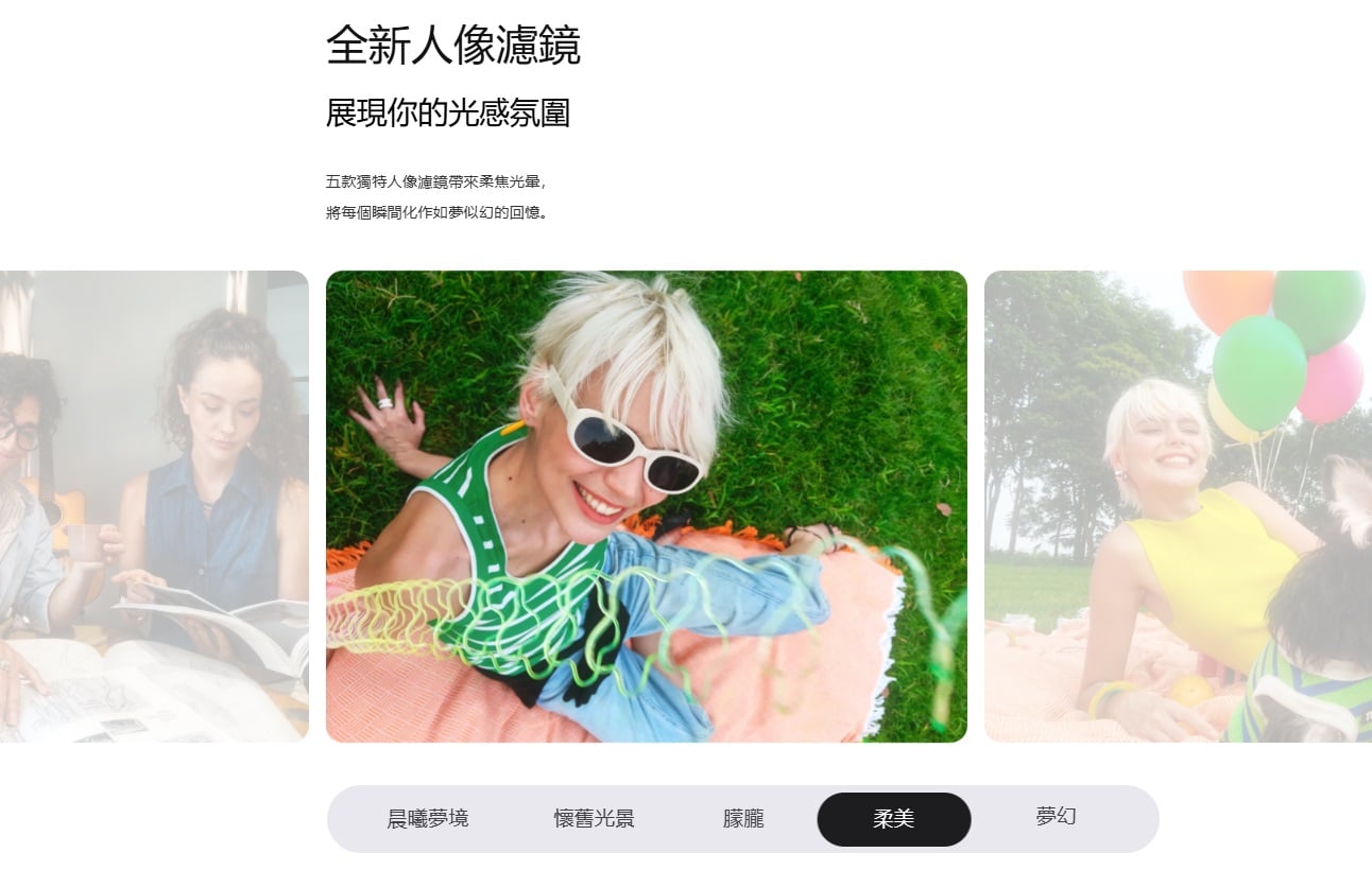 內建五款全新人像濾鏡(如「夢幻」、「柔美」、「懷舊光景」等),可拍出柔焦光暈效果,讓每張照片都像電影畫面一樣充滿氛圍感。