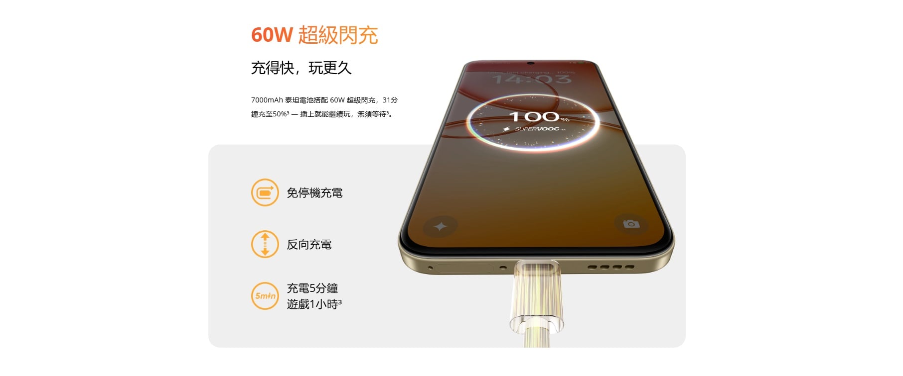 電池、充電:7000mAh 泰坦電池 + 60W 超級閃充