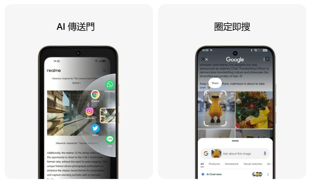 系統則搭載 realme UI 6.0(基於 Android 15),操作介面更流暢。新功能包含「AI 傳送門」、「圈定即搜」與「小膠囊狀態列」,提升效率與便利性。