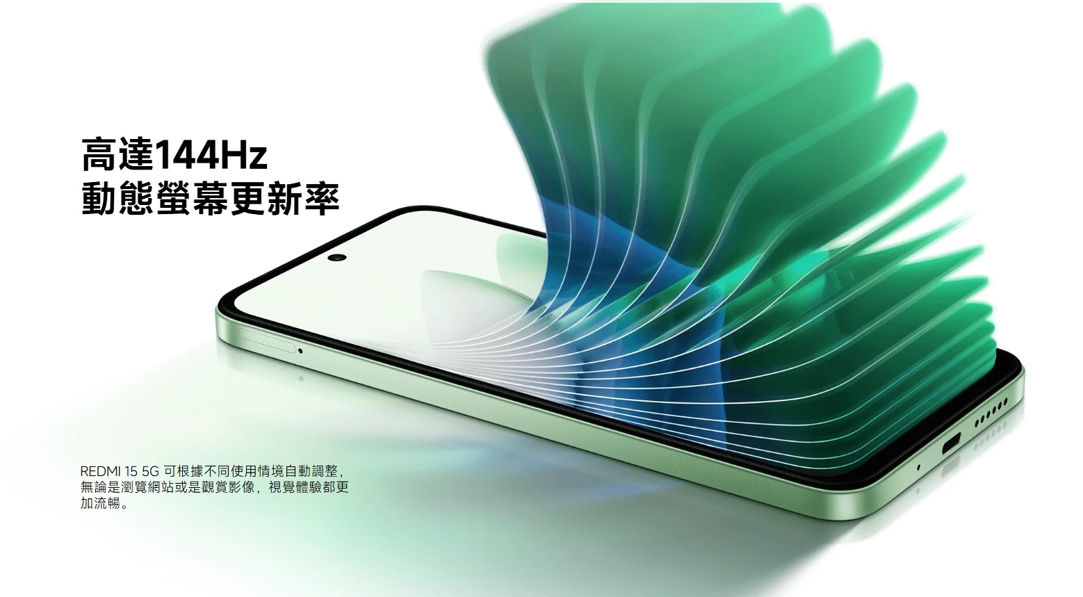 Redmi 15 5G 配備 6.9 吋 FHD+ 沉浸式螢幕,解析度清晰、色彩鮮明,視覺體驗相當細膩,支援 144Hz 高螢幕更新率,在滑社群、玩遊戲、追劇時都能保持流暢順眼。