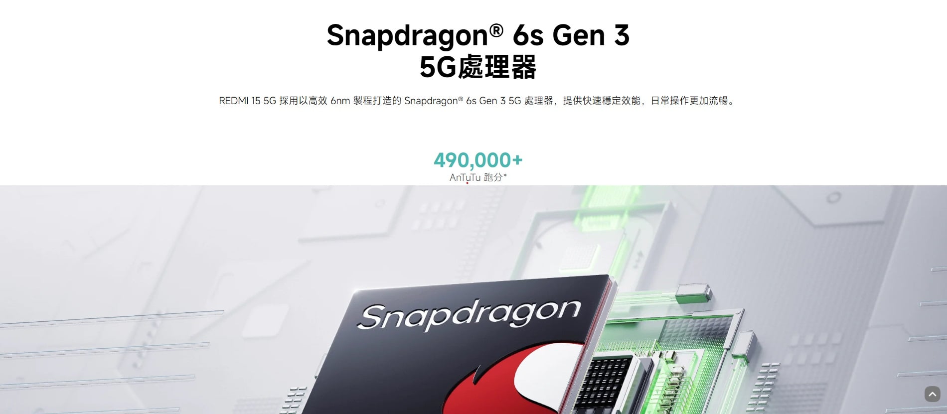 在效能方面,Redmi 15 採用 Snapdragon 6s Gen 3 5G 處理器,6nm 製程兼顧效能與能耗,AnTuTu 跑分突破 49 萬分。不論是多工操作、拍照、上網或玩手遊,都能維持流暢體驗。