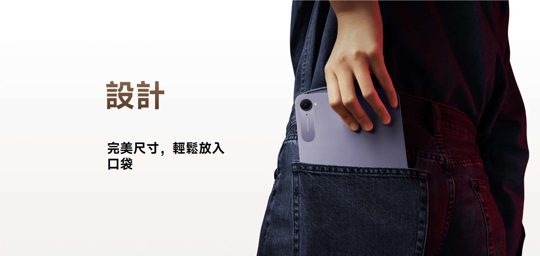 雖然尺寸偏小,但帶起來不用像大型平板較負擔,整台機身採用一體成型金屬背蓋,搭配陶瓷噴砂處理,視覺上有種柔霧質感,摸起來溫潤不冰手。兩種配色都簡潔乾淨,不會太浮誇、也不會太沉重,風格大眾化但質感到位。