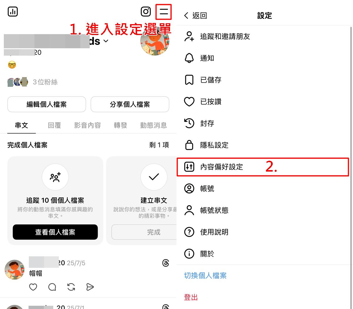 在個人頁右上角點選 「二」功能表>進入「內容偏好」設定頁面。