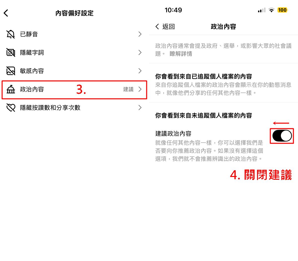 找到 「政治內容」>「建議政治內容」功能,你會看到開關選項: