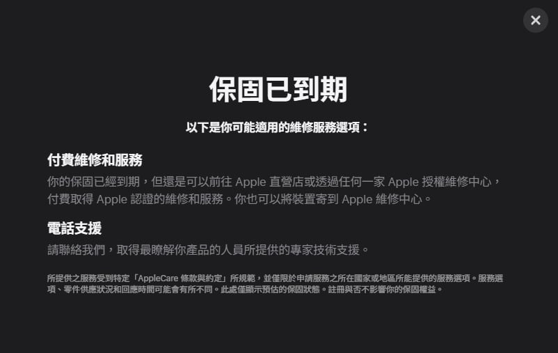 在頁面的第三項「維修和服務範圍」,指的就是iPhone的維修保固期囉!像下圖顯示「已到期」,就代表該裝置已超過1年的有限保固了。
